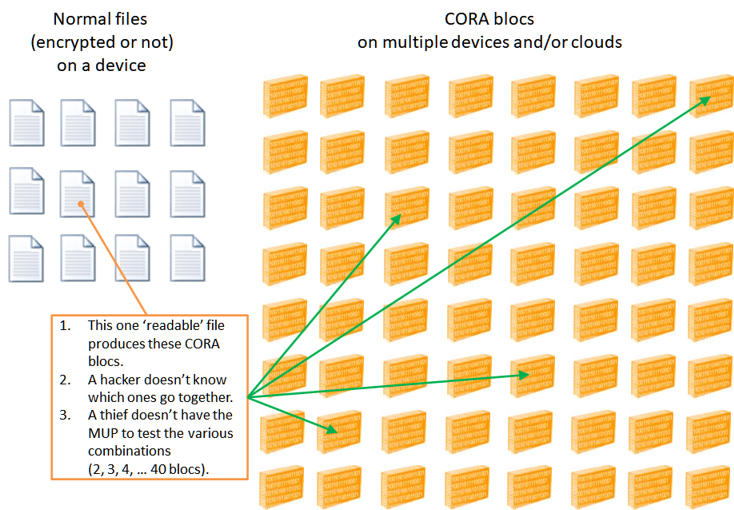 - If a single byte in the MUP or CORA blocs is corrupt, then the solution fails to decrypt. Hence ransomware that has infected CORAfied data will not propagate.